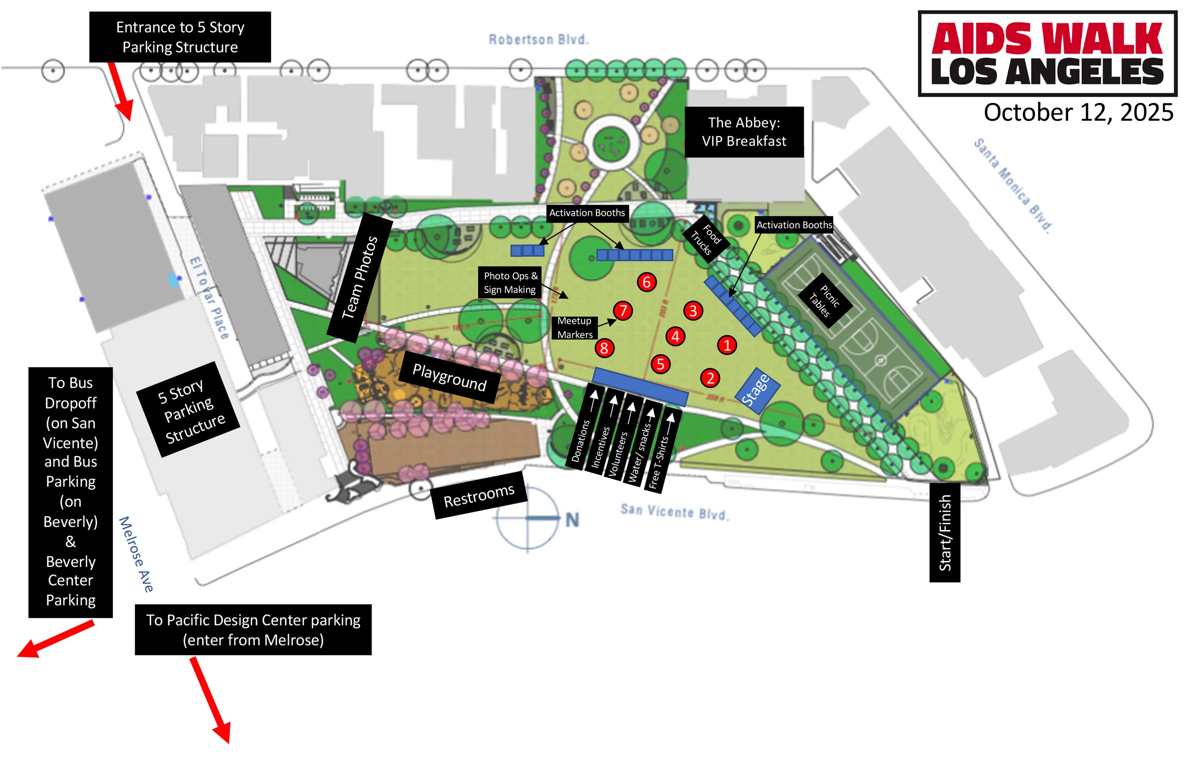 This year’s Walk course is approximately 2 miles. That’s 5,000 total steps, which most people do in about 45 minutes. The Walk will start and end in West Hollywood Park. Please see the map below of the route with directional arrows.
